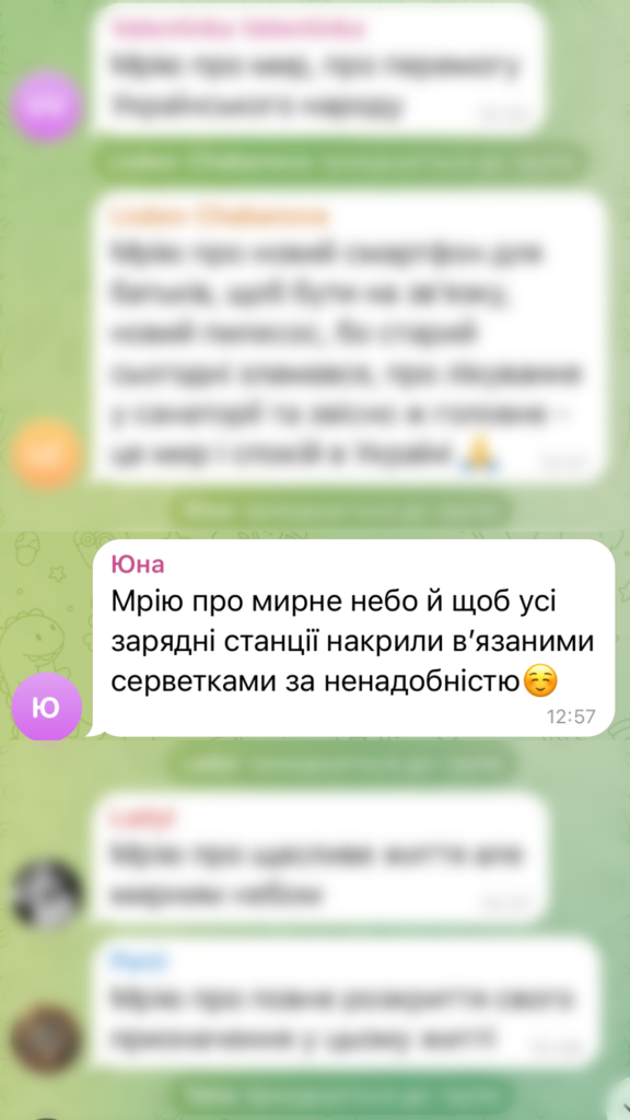 У Dealbook кожна активність — це можливість познайомитися ближче з нашою неймовірною спільнотою. Перша обрана учасниця активності вихідного дня, Юна, довела: щирість і влучний гумор — це справжня суперсила. Серед сотень повідомлень про плани та мрії, коментар Юни став справжнім хітом чату. Вона написала: «Мрію про мирне небо й щоб усі зарядні станції накрили в’язаними серветками за ненадобністю». Ця фраза настільки відгукнулася кожному з нас, що вибір отримувача винагороди став очевидним.